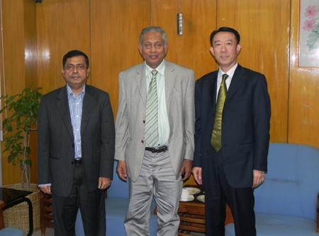 韶关泰洁防护科技有限公司股份董事長鄒寶中會見孟加拉工業部長(中)、部秘(左)